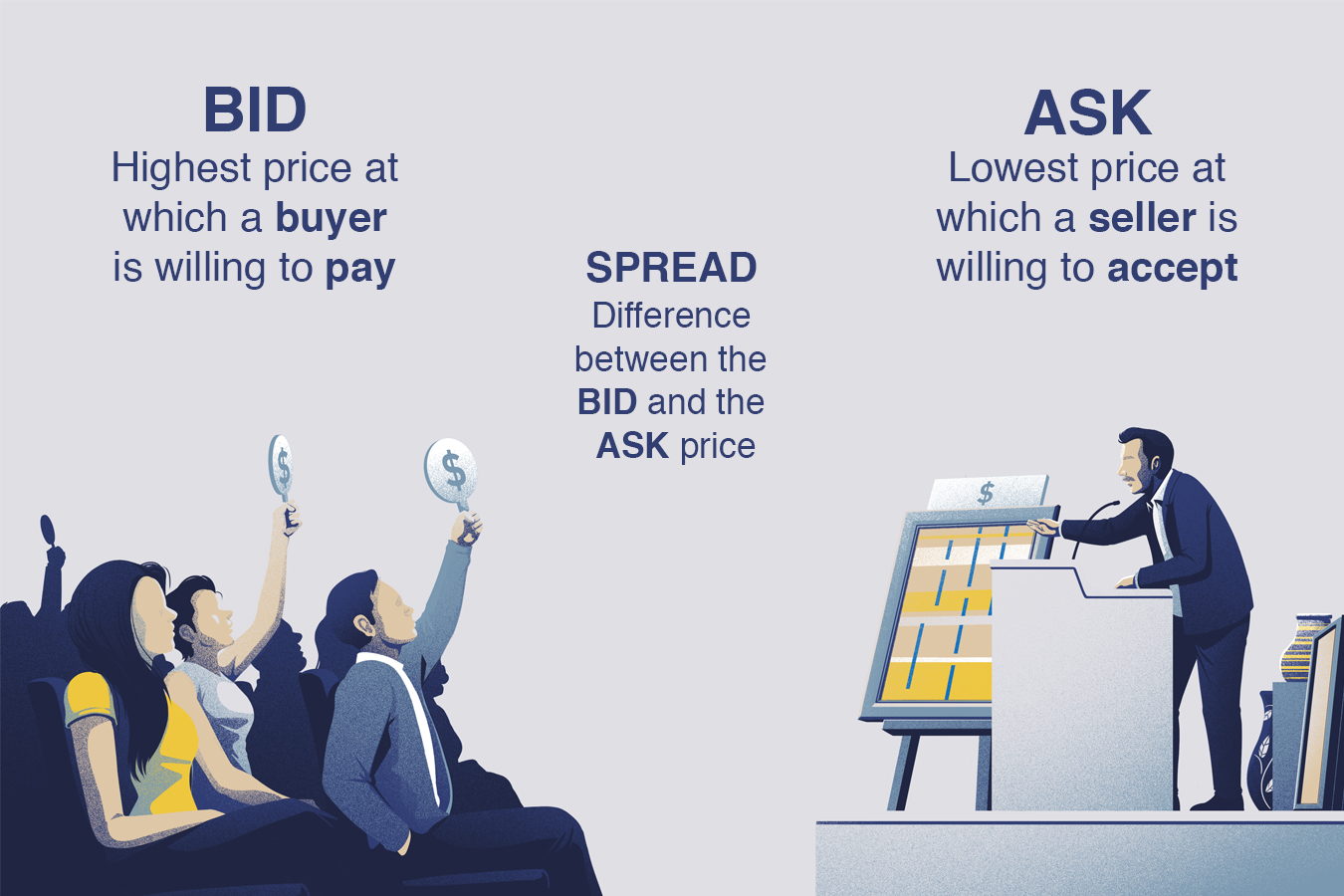Like any marketplace, there are two sides to every trade: a buyer and a seller. A buyer submits a bid, which is the highest price they're willing to pay for a security, while a seller submits an ask, which is the lowest price they're willing to accept.