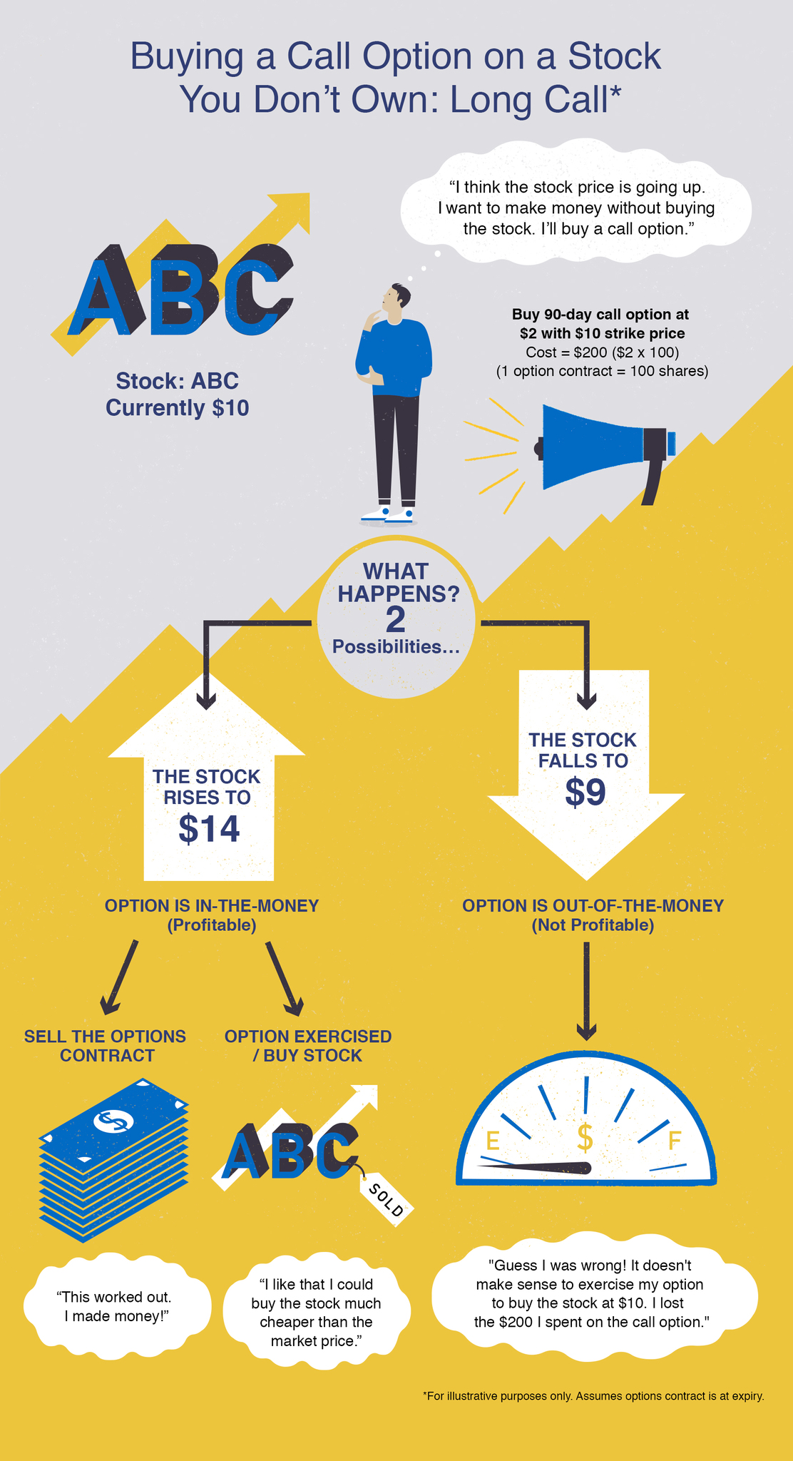 You decide to buy one call option contract on company ABC with a strike price of $10. It expires in 90 days. (1 option contract = 100 ABC shares)