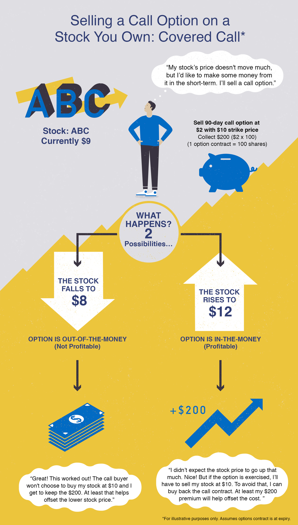You decide to sell one call option contract on company ABC with a strike price of $10. It expires in 90 days. (1 option contract = 100 ABC shares)