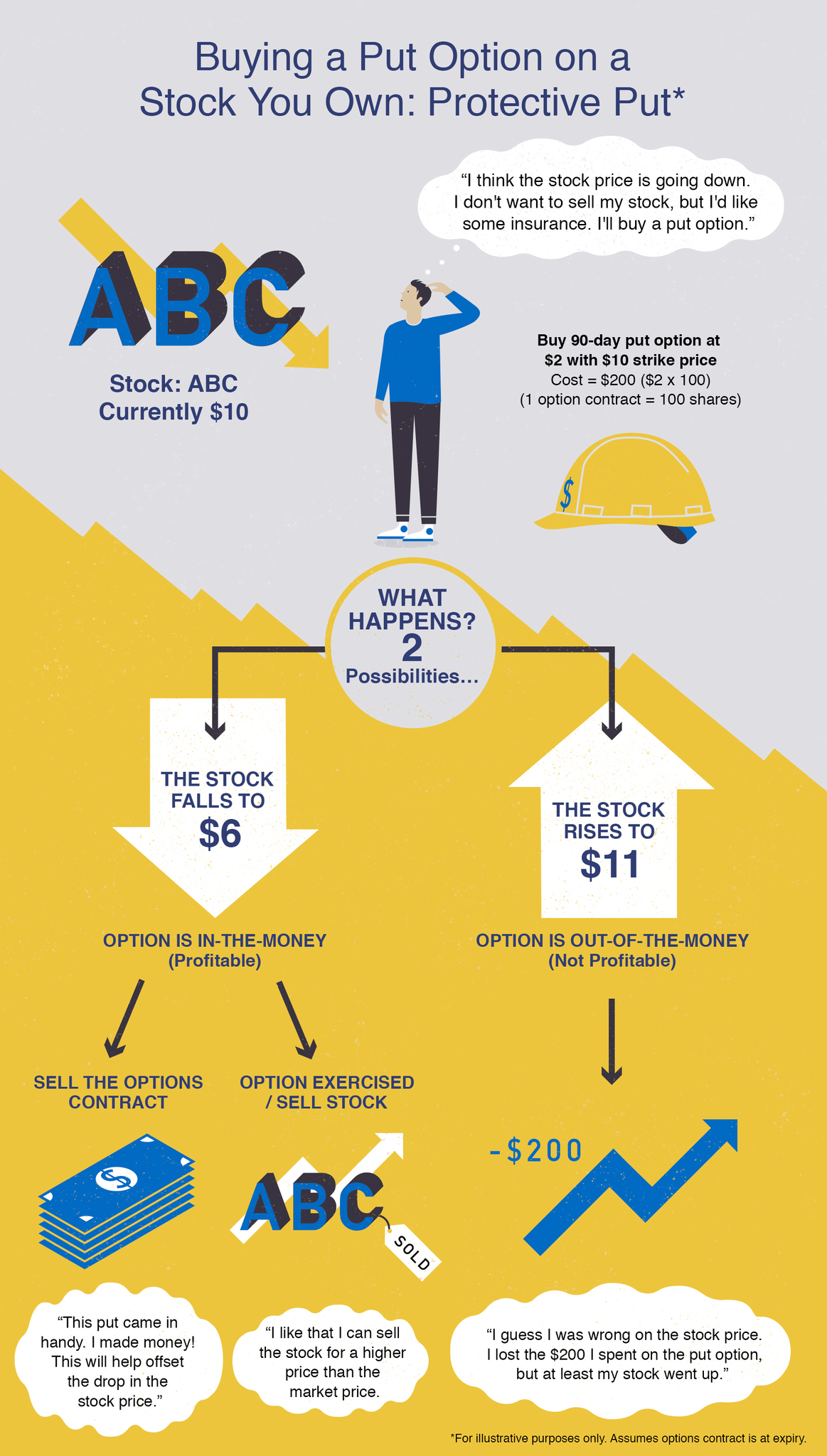 You decide to buy one put option contract on company ABC with a strike price of $10. It expires in 90 days. (1 option contract = 100 ABC shares)