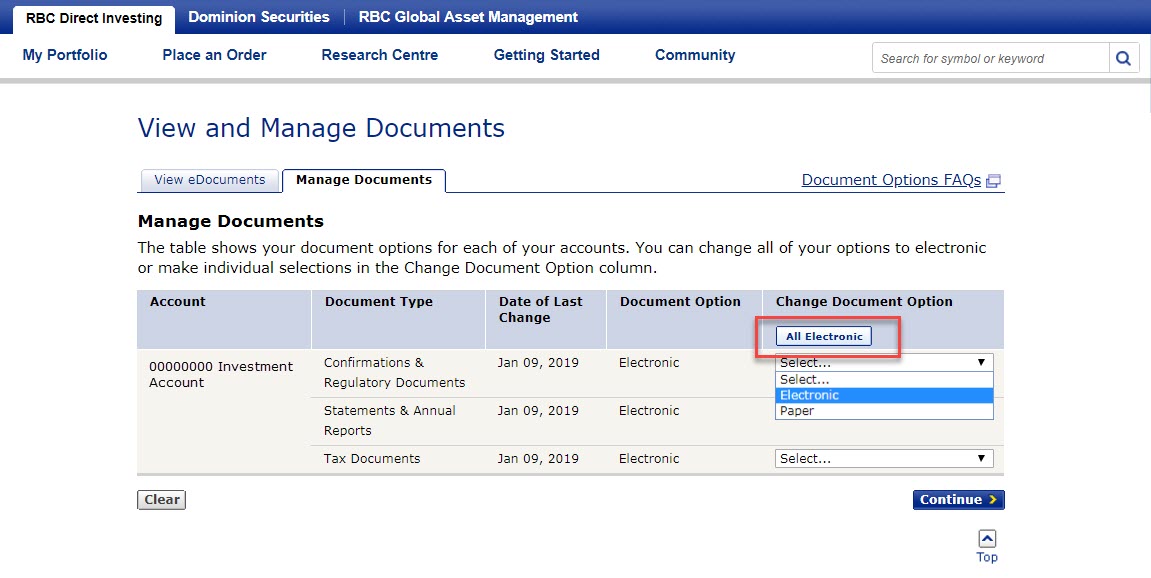 - Select the “All Electronic” button to begin receiving all of your documents electronically. You can also use the drop-down menu next to each type of document (tax documents, confirmations, account statements and annual reports or regulatory documents) to choose electronic or paper delivery. Next, select "Continue" and provide your consent for electronic delivery. Once you provide consent for electronic delivery, you will no longer receive printed copies in the mail.