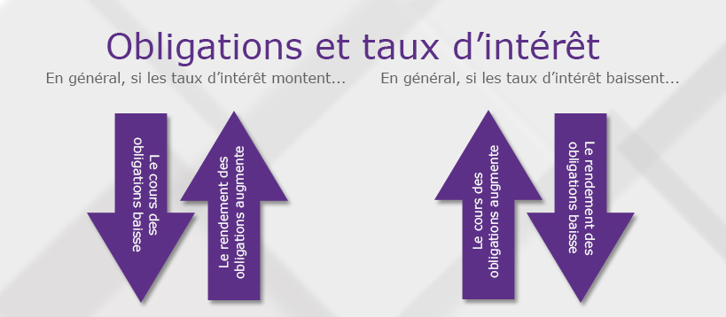 L’évolution des taux d’intérêt peut avoir des répercussions négatives sur les obligations, puisque leur prix varie habituellement en sens inverse de celui des taux d’intérêt. Comptant parmi les quelques facteurs qui influent sur les obligations (le risque d’inflation et le risque de crédit en sont d’autres), le risque de taux d’intérêt désigne le risque qu’une hausse des taux d’intérêt entraîne une réduction de la valeur marchande d’une obligation. Pourquoi en est-il ainsi? Le prix d’une obligation peut diminuer si son taux d’intérêt nominal est inférieur à celui des obligations comparables récemment émises. Toutefois, la diminution du prix de l’obligation s’accompagne de l’augmentation de son rendement en revenu de sorte qu’elle demeure concurrentielle sur le marché.